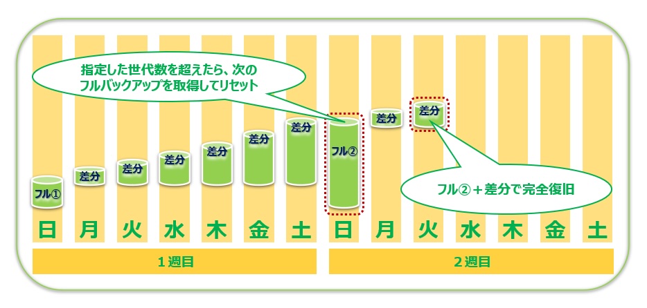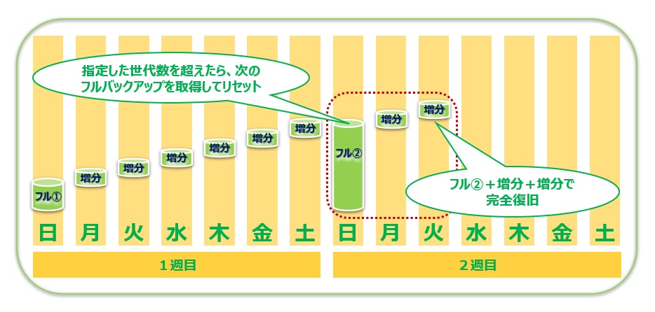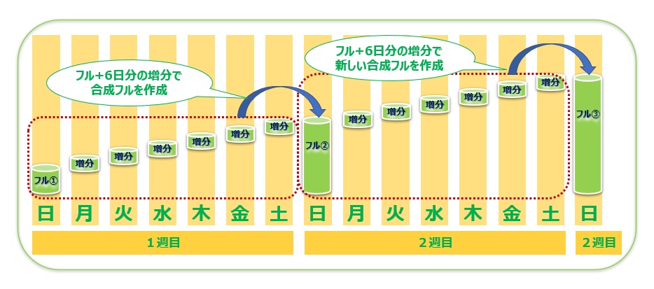 設定した世代数を超えるとフルバックアップと増分データを合成し、